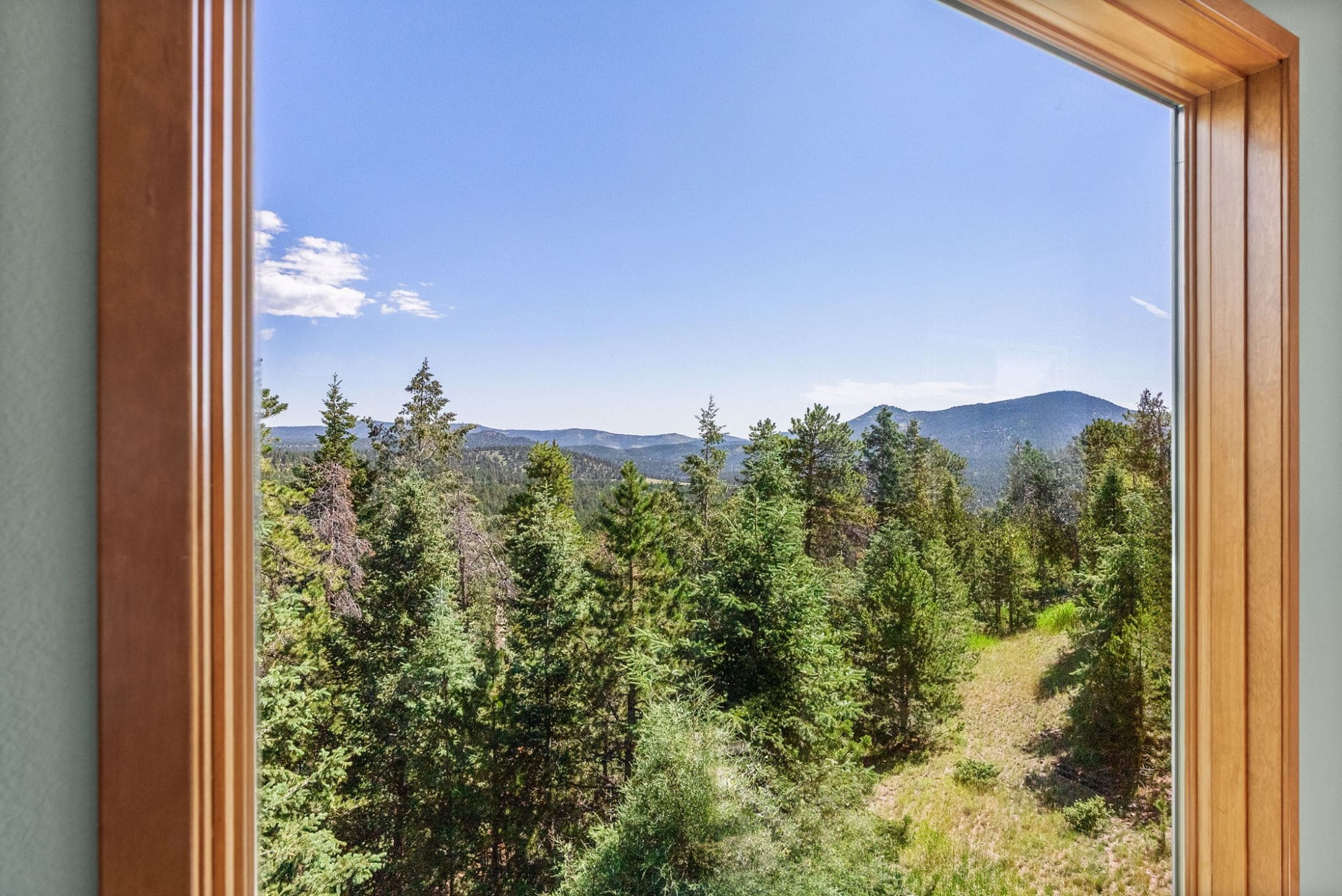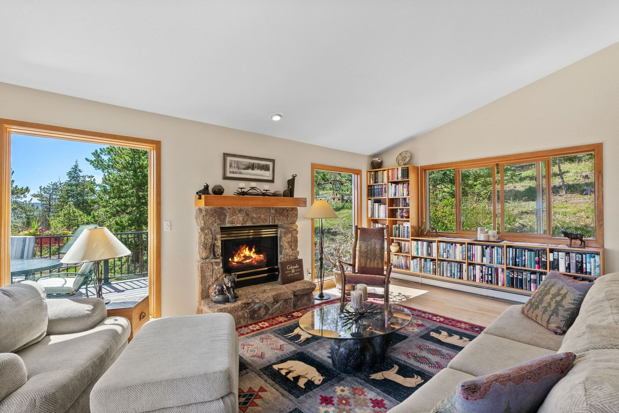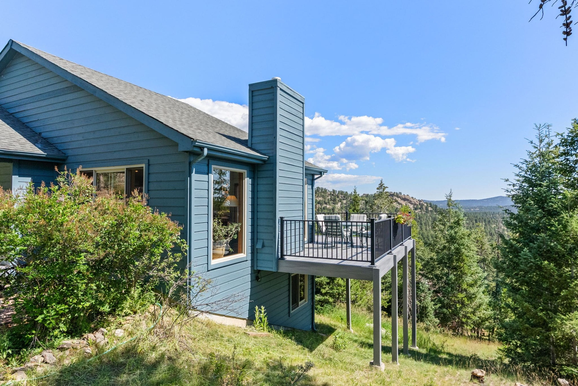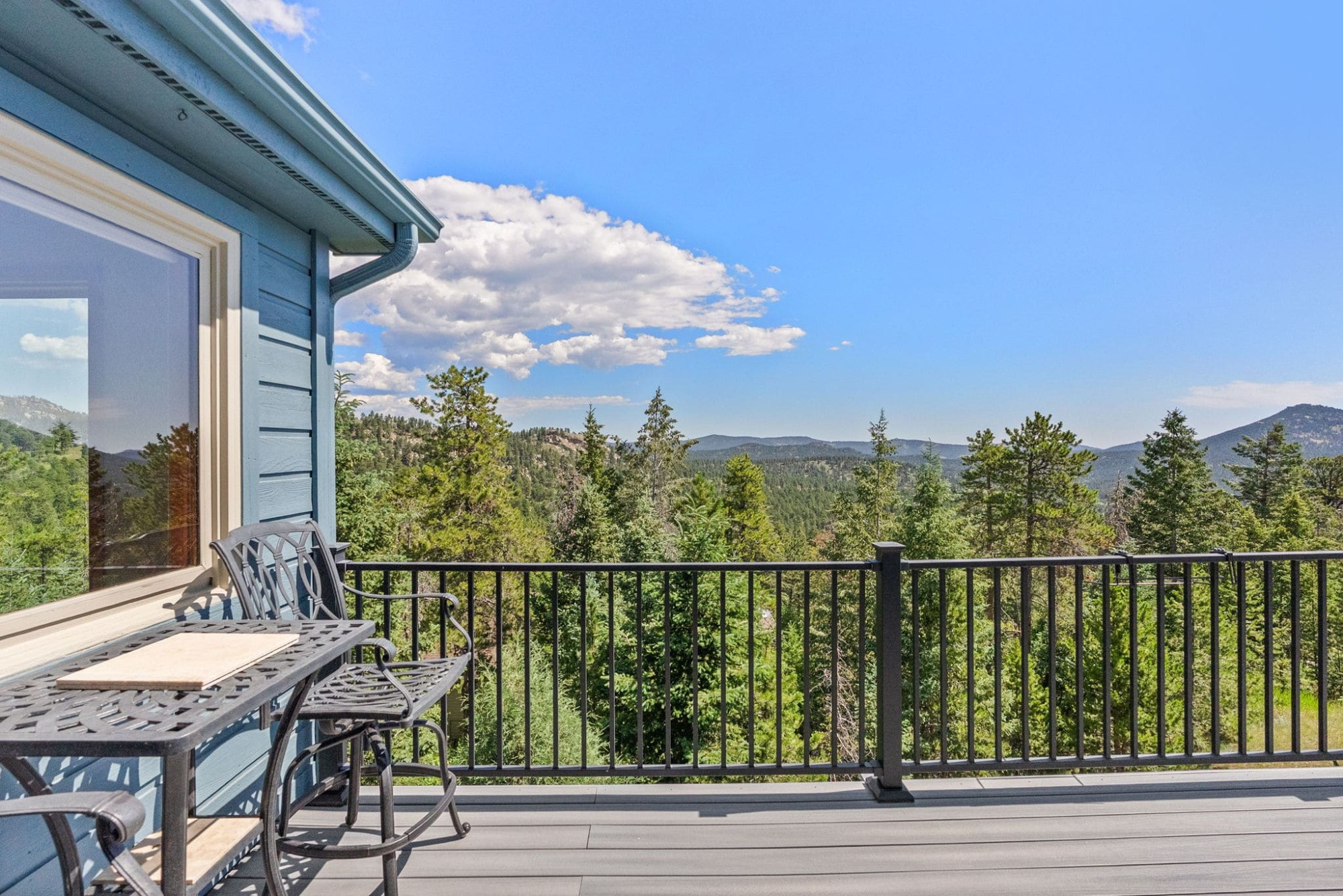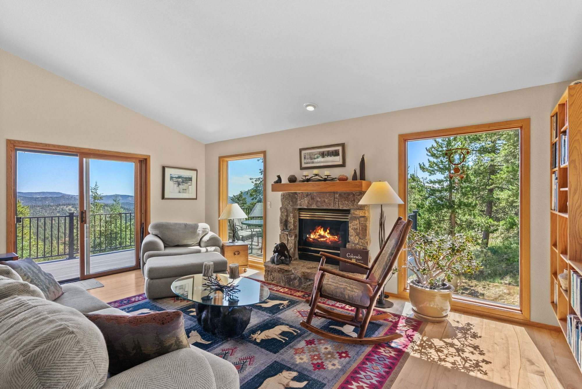 This is the kind of home that makes Evergreen living feel effortless. Elephant Butte Park sits directly behind the property, while the Alderfer Three Sisters trail system is just steps out the front door, putting miles of hiking and biking into everyday reach. Composite decks offer inviting outdoor space to relax, entertain, or enjoy the fresh mountain air. The main level living room is filled with natural light, wrapped in windows, and anchored by vaulted ceilings, a gas fireplace, and newly refinished red birch hardwood floors, creating an open and welcoming space for everyday living and gathering. Large windows throughout the home capture mountain vistas and forest views, reinforcing the connection to the outdoors. The primary suite is a true retreat, featuring expansive floor to ceiling windows, generous proportions, an en suite bath, and a private office tucked behind French doors, ideal for work from home or creative space. The office could also function as a non conforming fourth bedroom (due to septic capacity). A second bedroom on the main level provides flexibility for guests or additional living needs. The kitchen features granite counters, stainless steel appliances, and ample cabinetry, opening comfortably to the dining area for daily living or casual gatherings. The walkout lower level adds a second living room plus a spacious bedroom with en suite bath, offering privacy for guests or multigenerational living. All three bathrooms have been updated with granite counters, and the exterior was painted in summer 2024, reflecting thoughtful upkeep. Located approximately 3 miles from downtown Evergreen amenities and near top rated schools, this home brings together trail access, views, and everyday convenience in one inviting setting.