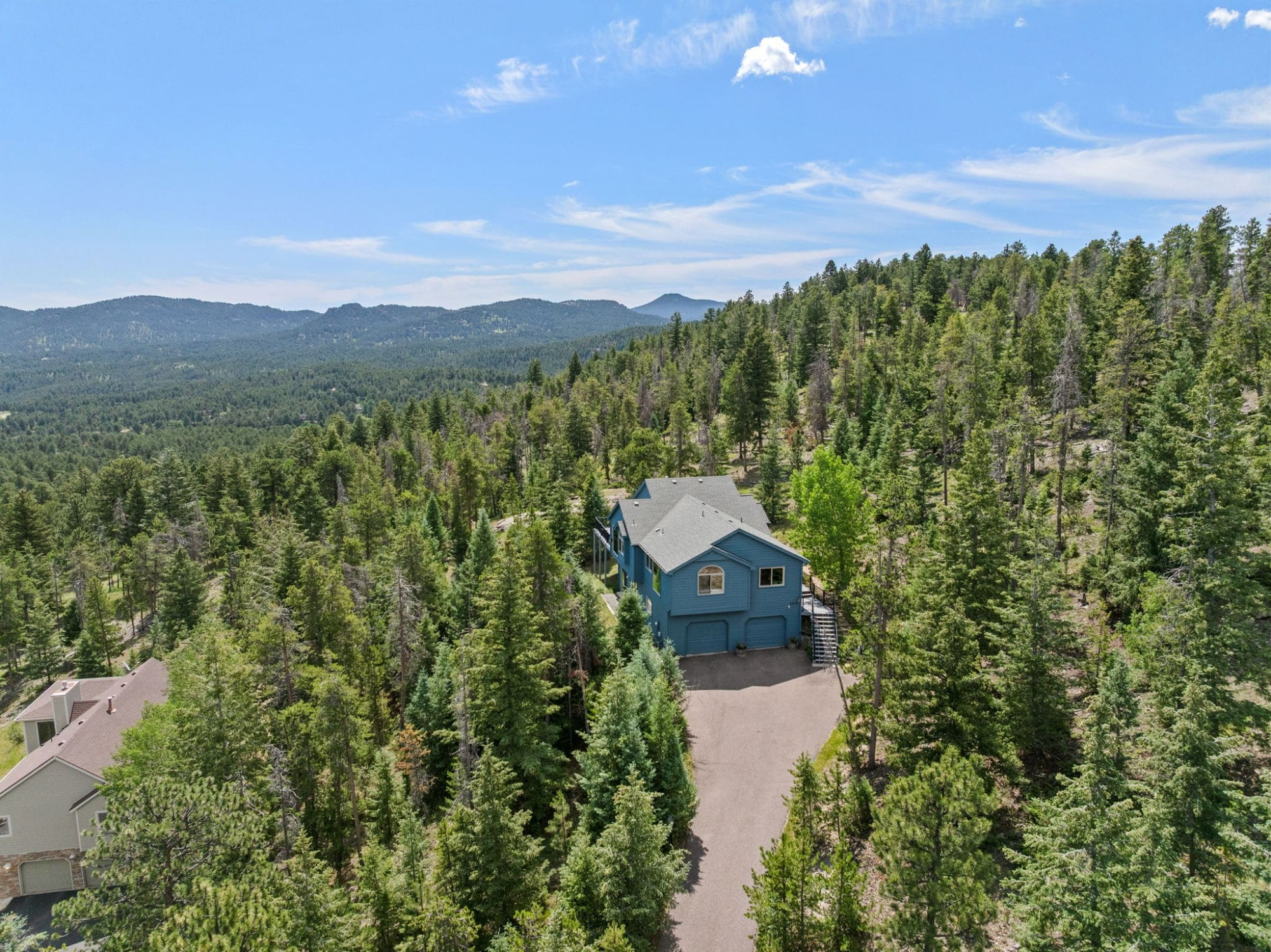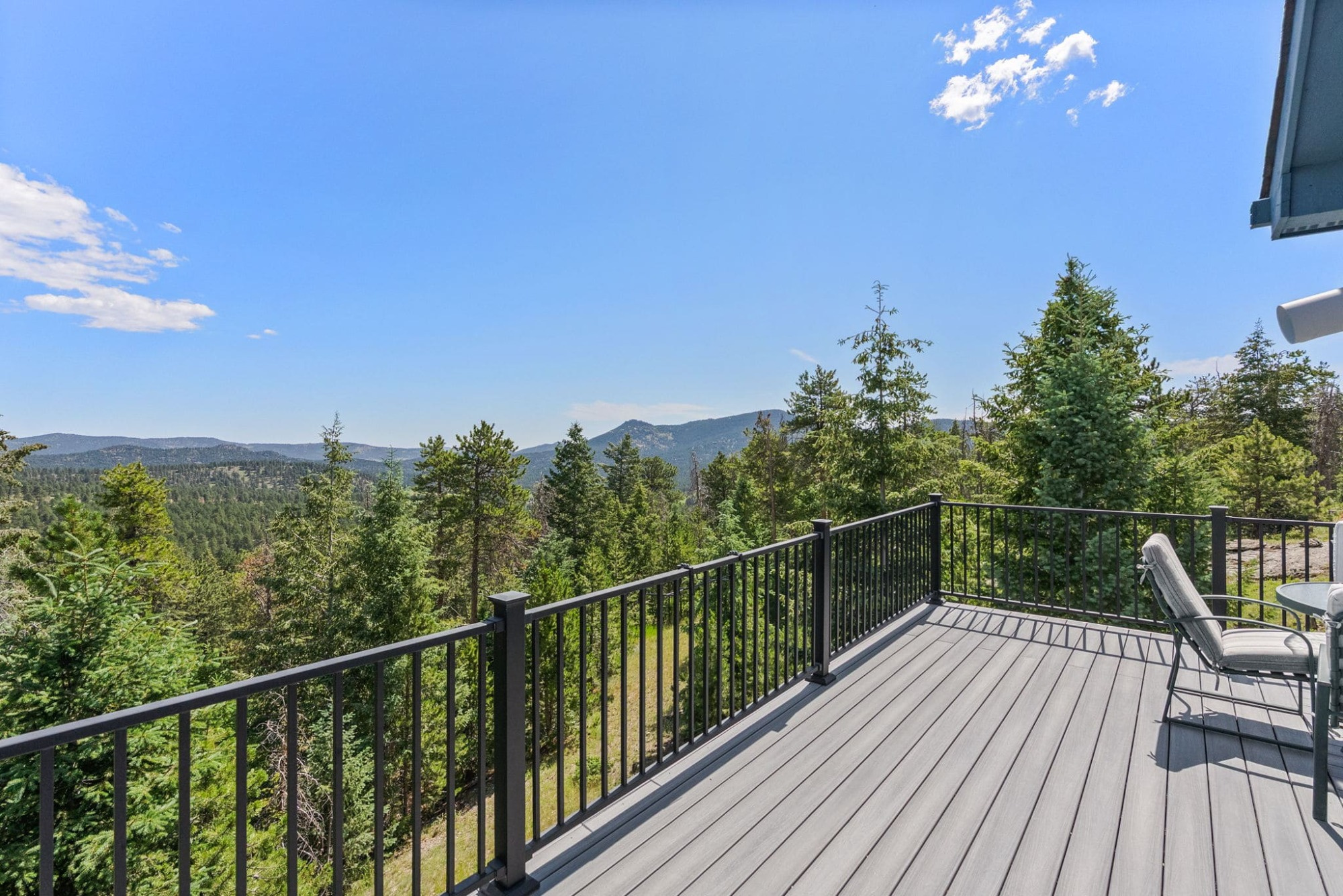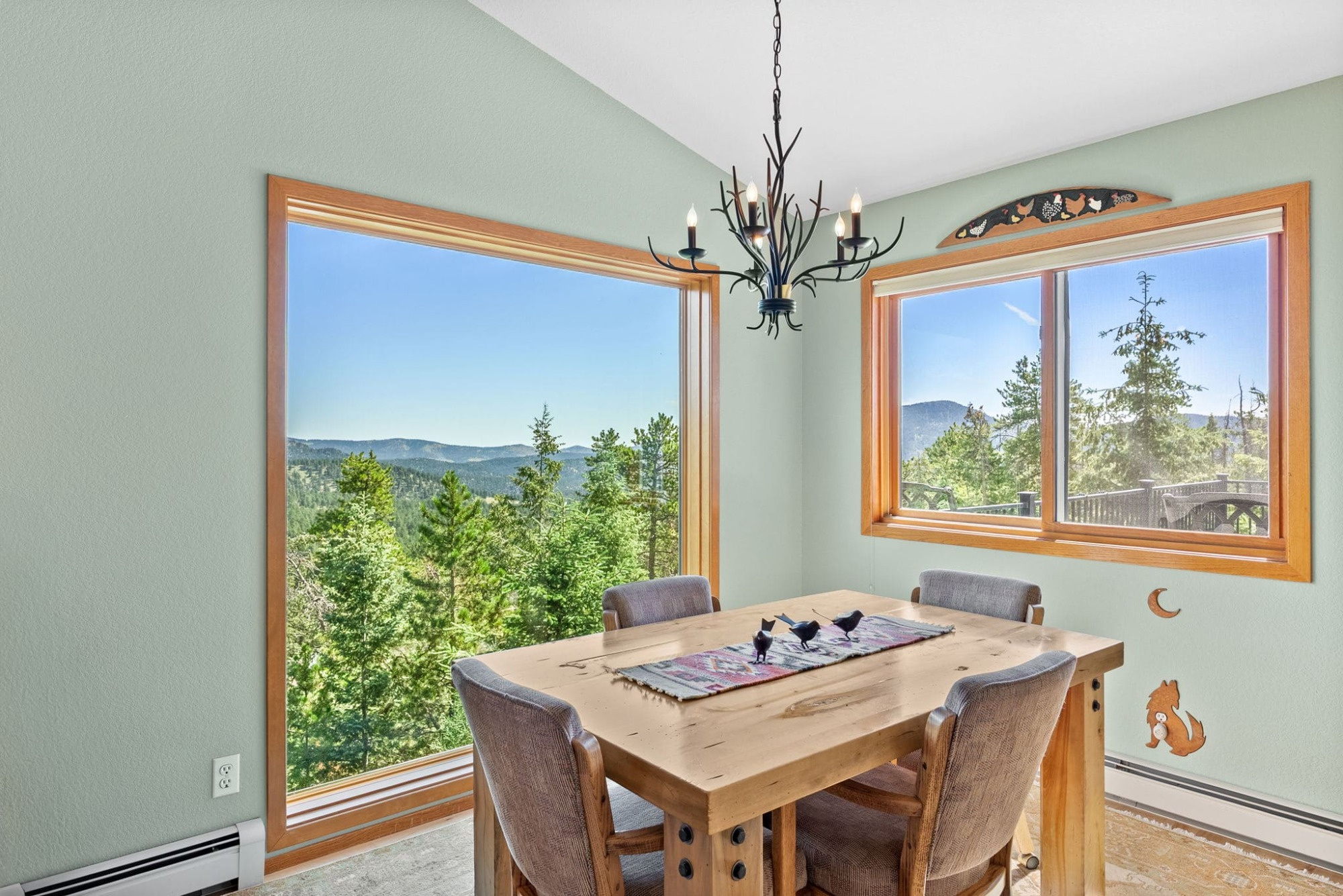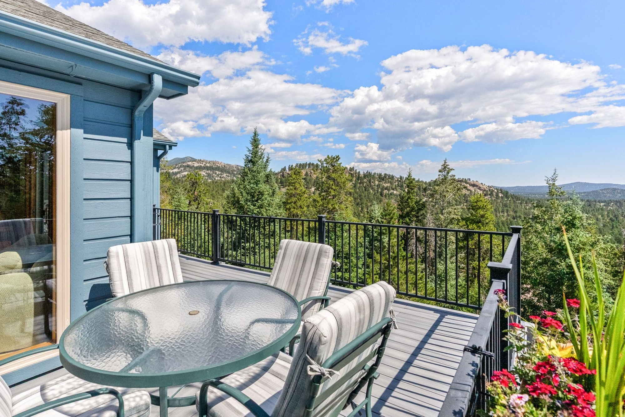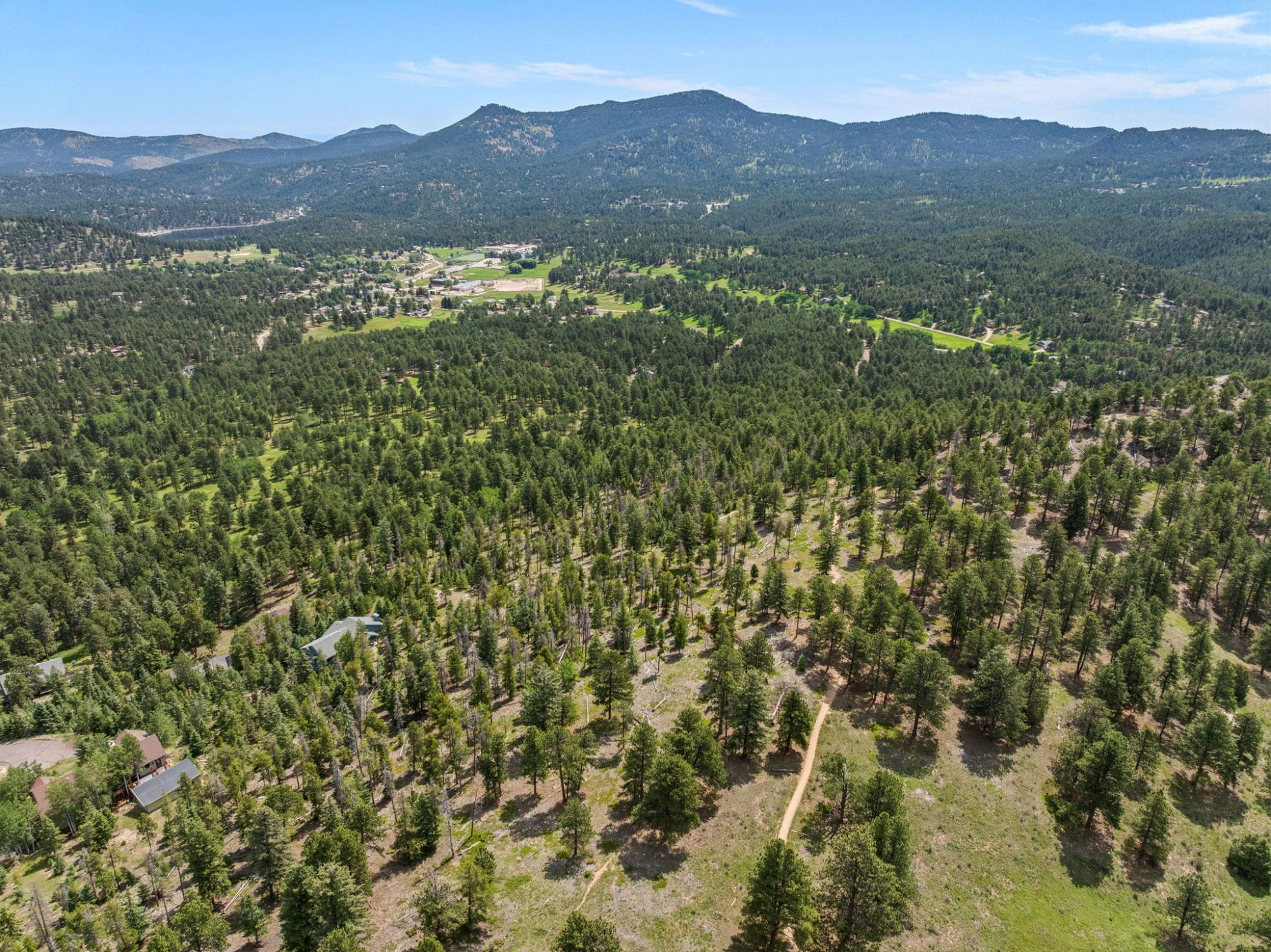This is the kind of home that makes Evergreen living feel effortless. Elephant Butte Park sits directly behind the property, while the Alderfer Three Sisters trail system is just steps out the front door, putting miles of hiking and biking into everyday reach. Composite decks offer inviting outdoor space to relax, entertain, or enjoy the fresh mountain air. The main level living room is filled with natural light, wrapped in windows, and anchored by vaulted ceilings, a gas fireplace, and newly refinished red birch hardwood floors, creating an open and welcoming space for everyday living and gathering. Large windows throughout the home capture mountain vistas and forest views, reinforcing the connection to the outdoors. The primary suite is a true retreat, featuring expansive floor to ceiling windows, generous proportions, an en suite bath, and a private office tucked behind French doors, ideal for work from home or creative space. The office could also function as a non conforming fourth bedroom (due to septic capacity). A second bedroom on the main level provides flexibility for guests or additional living needs. The kitchen features granite counters, stainless steel appliances, and ample cabinetry, opening comfortably to the dining area for daily living or casual gatherings. The walkout lower level adds a second living room plus a spacious bedroom with en suite bath, offering privacy for guests or multigenerational living. All three bathrooms have been updated with granite counters, and the exterior was painted in summer 2024, reflecting thoughtful upkeep. Located approximately 3 miles from downtown Evergreen amenities and near top rated schools, this home brings together trail access, views, and everyday convenience in one inviting setting.