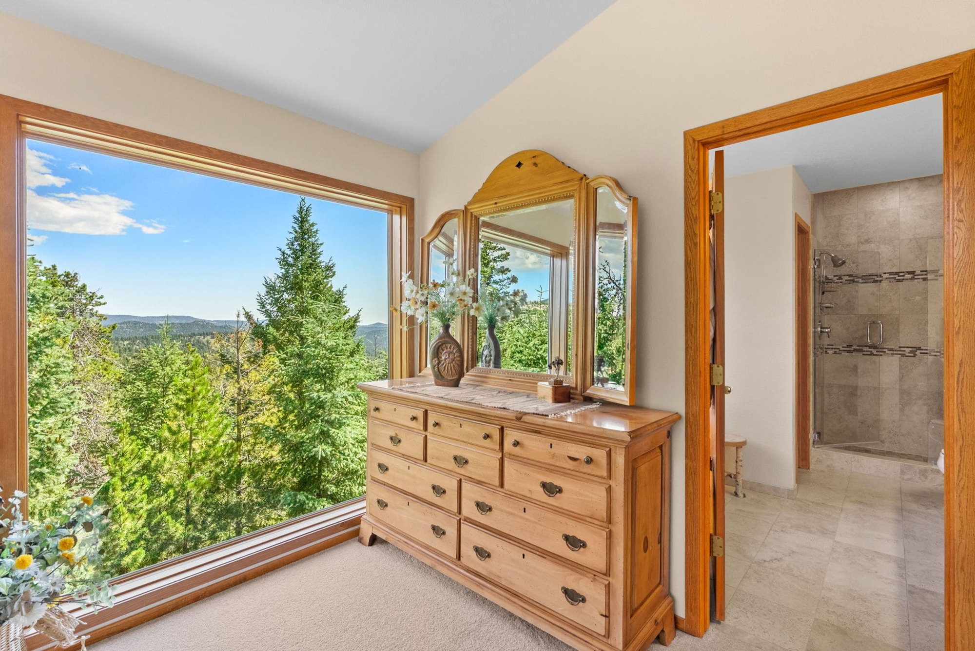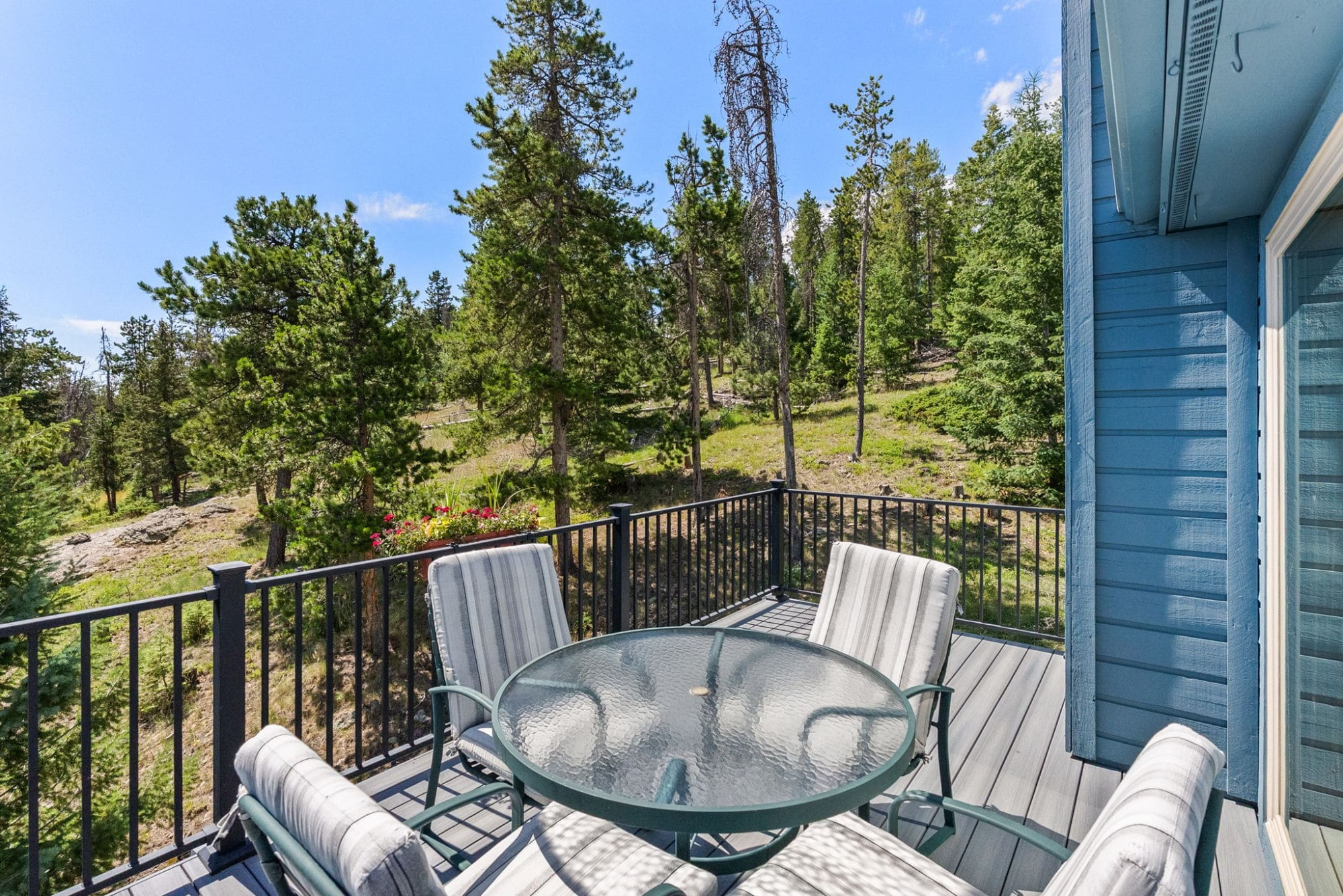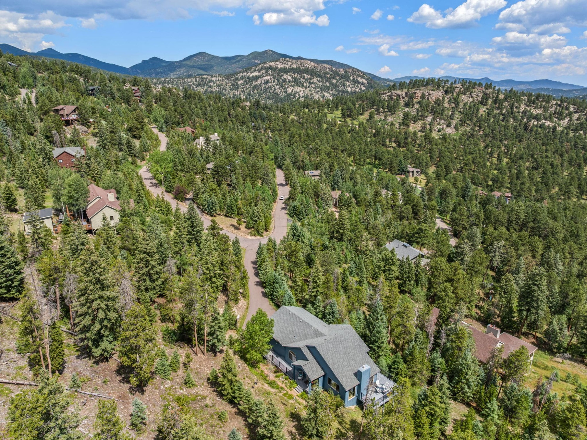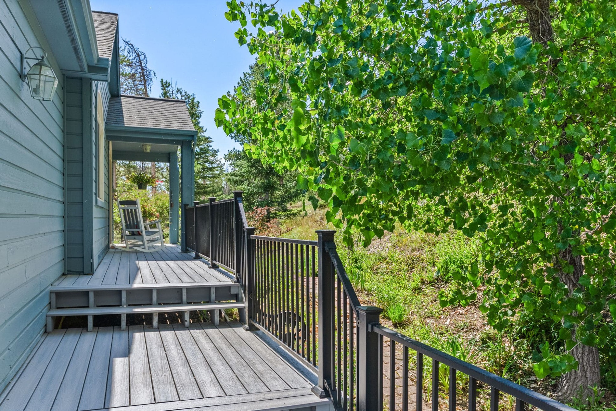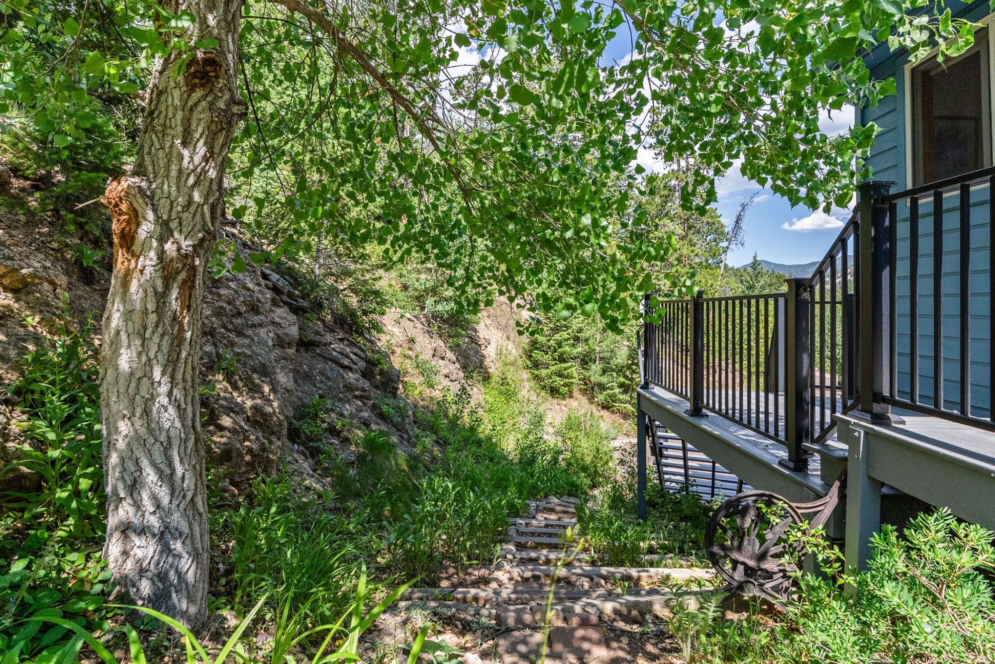 This is the kind of home that makes Evergreen living feel effortless. Elephant Butte Park sits directly behind the property, while the Alderfer Three Sisters trail system is just steps out the front door, putting miles of hiking and biking into everyday reach. Composite decks offer inviting outdoor space to relax, entertain, or enjoy the fresh mountain air. The main level living room is filled with natural light, wrapped in windows, and anchored by vaulted ceilings, a gas fireplace, and newly refinished red birch hardwood floors, creating an open and welcoming space for everyday living and gathering. Large windows throughout the home capture mountain vistas and forest views, reinforcing the connection to the outdoors. The primary suite is a true retreat, featuring expansive floor to ceiling windows, generous proportions, an en suite bath, and a private office tucked behind French doors, ideal for work from home or creative space. The office could also function as a non conforming fourth bedroom (due to septic capacity). A second bedroom on the main level provides flexibility for guests or additional living needs. The kitchen features granite counters, stainless steel appliances, and ample cabinetry, opening comfortably to the dining area for daily living or casual gatherings. The walkout lower level adds a second living room plus a spacious bedroom with en suite bath, offering privacy for guests or multigenerational living. All three bathrooms have been updated with granite counters, and the exterior was painted in summer 2024, reflecting thoughtful upkeep. Located approximately 3 miles from downtown Evergreen amenities and near top rated schools, this home brings together trail access, views, and everyday convenience in one inviting setting.