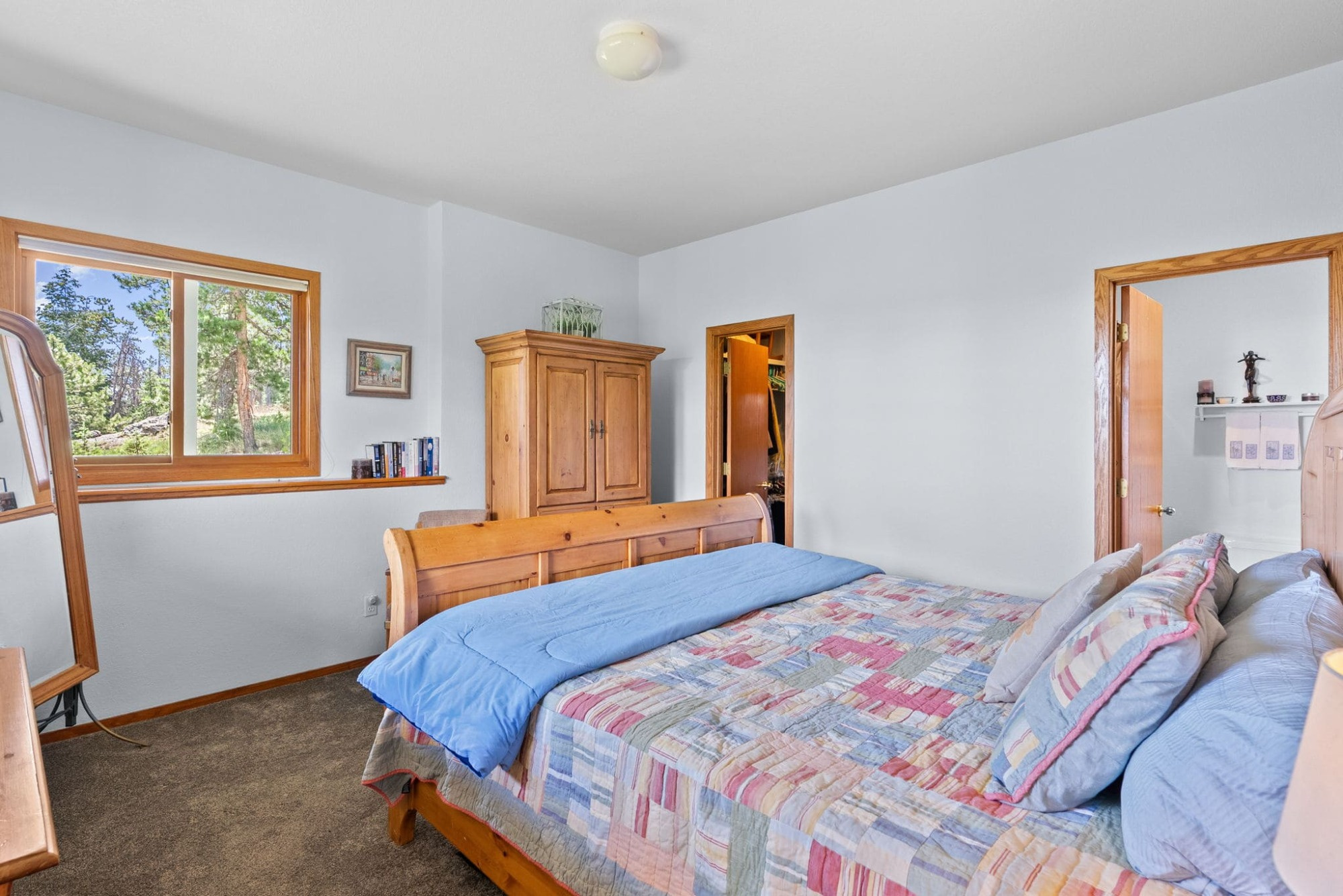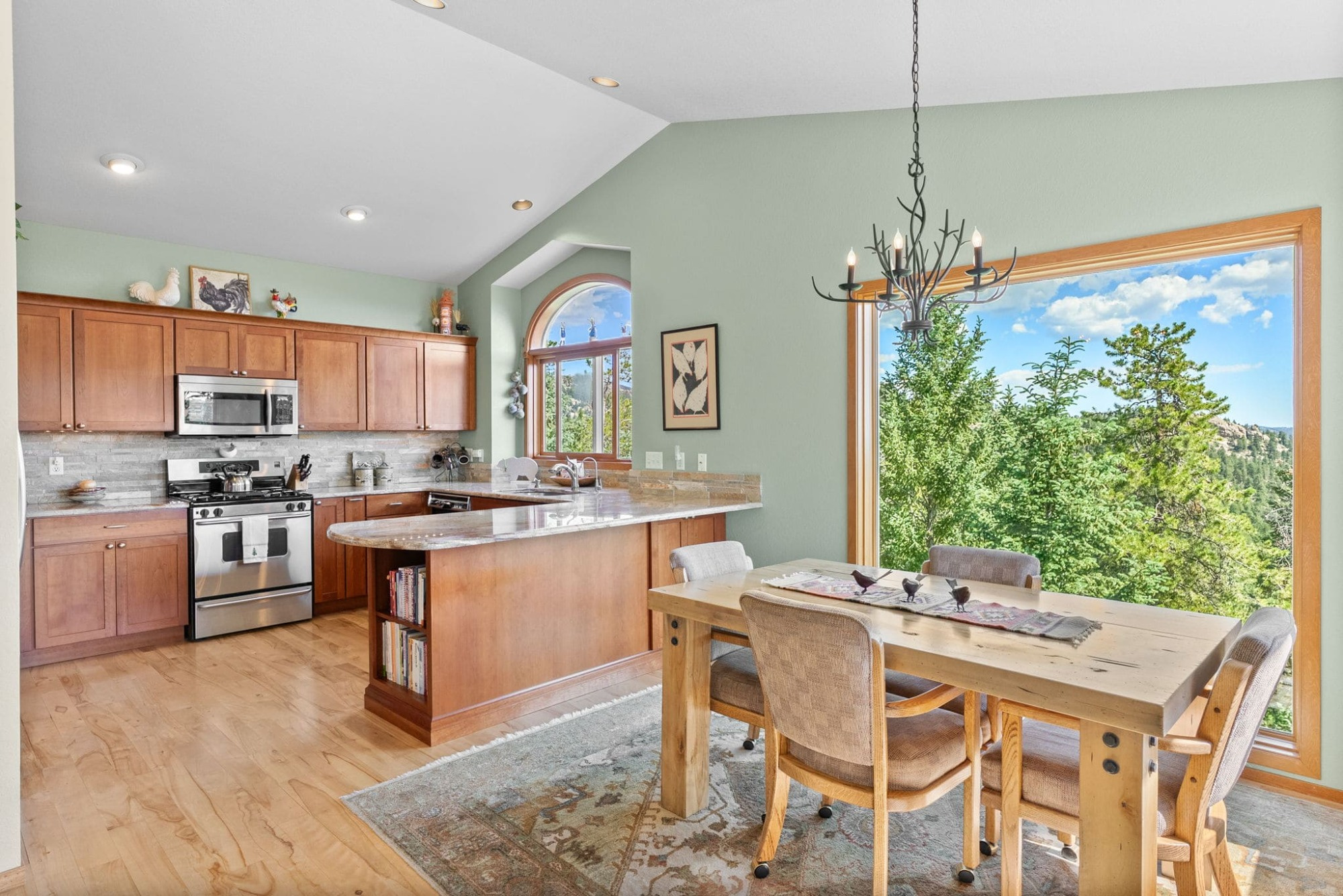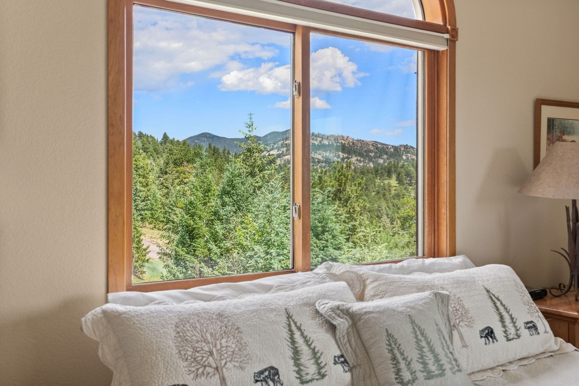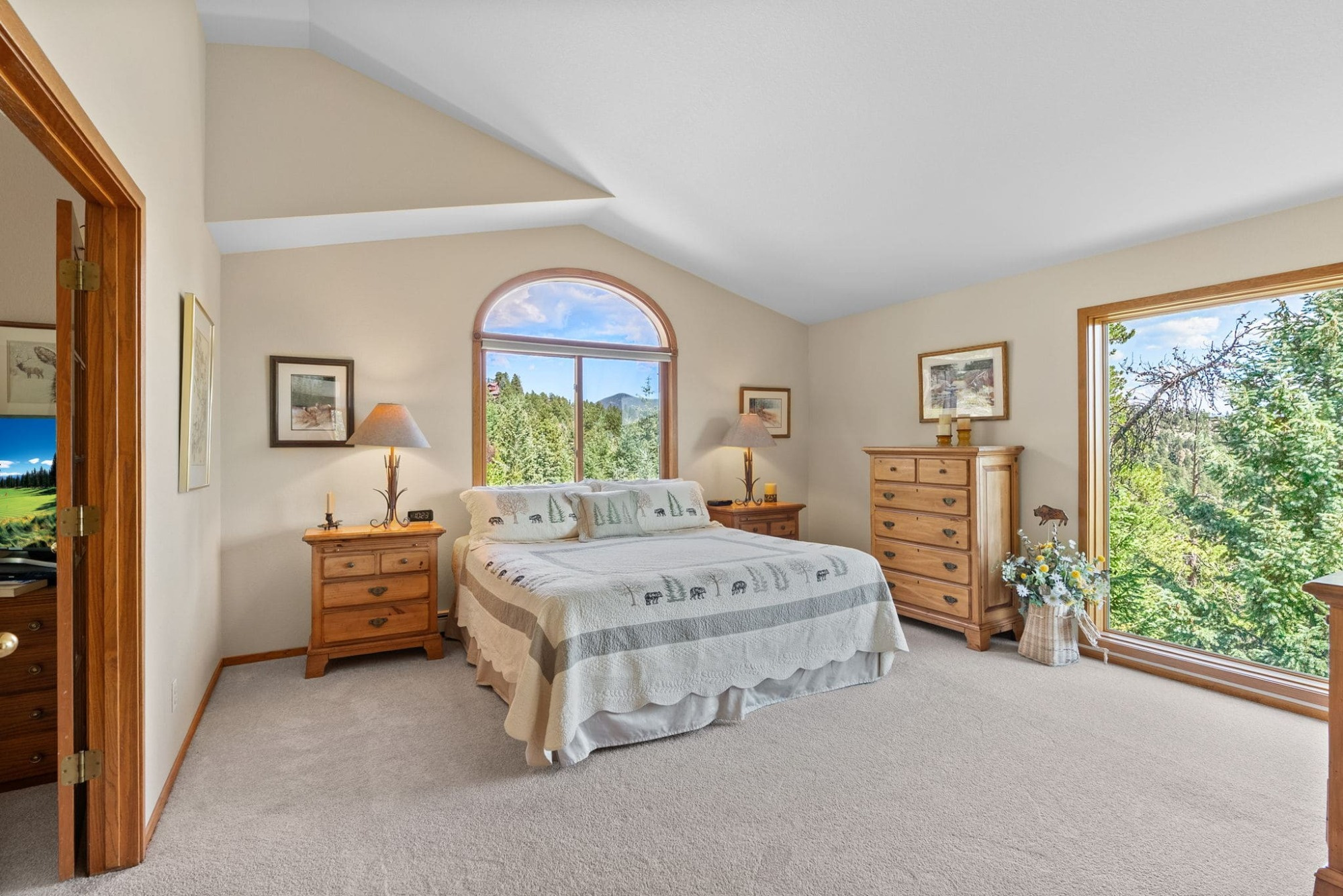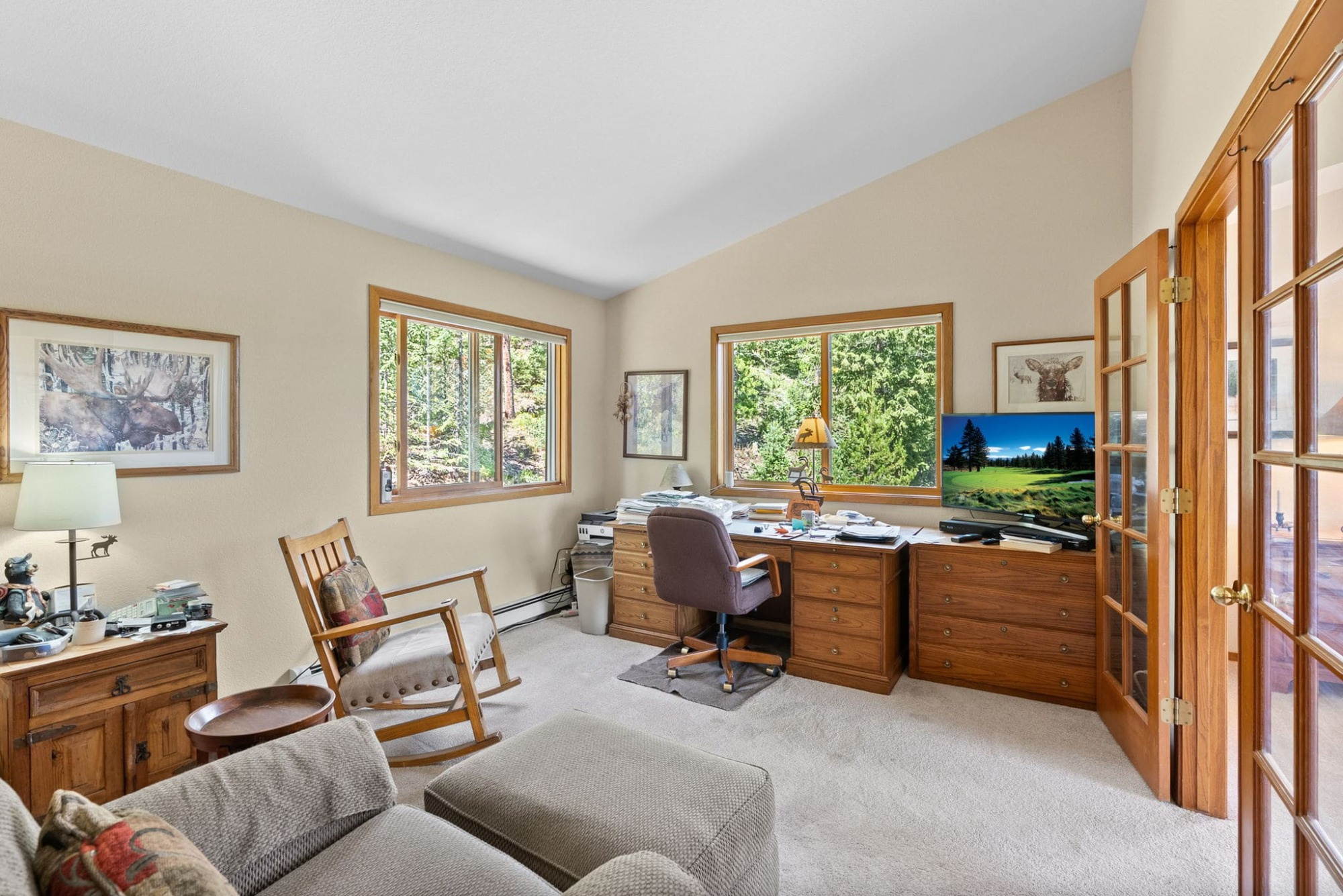 This is the kind of home that makes Evergreen living feel effortless. Elephant Butte Park sits directly behind the property, while the Alderfer Three Sisters trail system is just steps out the front door, putting miles of hiking and biking into everyday reach. Composite decks offer inviting outdoor space to relax, entertain, or enjoy the fresh mountain air. The main level living room is filled with natural light, wrapped in windows, and anchored by vaulted ceilings, a gas fireplace, and newly refinished red birch hardwood floors, creating an open and welcoming space for everyday living and gathering. Large windows throughout the home capture mountain vistas and forest views, reinforcing the connection to the outdoors. The primary suite is a true retreat, featuring expansive floor to ceiling windows, generous proportions, an en suite bath, and a private office tucked behind French doors, ideal for work from home or creative space. The office could also function as a non conforming fourth bedroom (due to septic capacity). A second bedroom on the main level provides flexibility for guests or additional living needs. The kitchen features granite counters, stainless steel appliances, and ample cabinetry, opening comfortably to the dining area for daily living or casual gatherings. The walkout lower level adds a second living room plus a spacious bedroom with en suite bath, offering privacy for guests or multigenerational living. All three bathrooms have been updated with granite counters, and the exterior was painted in summer 2024, reflecting thoughtful upkeep. Located approximately 3 miles from downtown Evergreen amenities and near top rated schools, this home brings together trail access, views, and everyday convenience in one inviting setting.